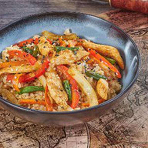 Состав: Рис гохан, курица, перец болгарский, морковь, капуста пекинская, фасоль стручковая, лук репчатый, соус вок, кунжут