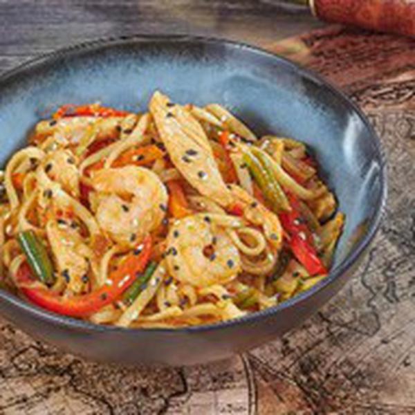 Состав: Лапша рамен, курица, креветка, перец болгарский, морковь, капуста пекинская, фасоль стручковая, лук репчатый, соус Чили сладкий, кунжут