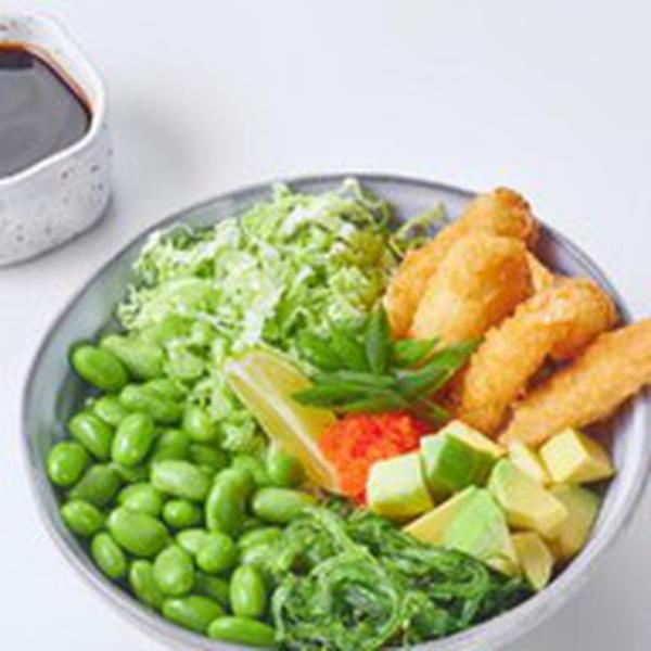 Состав: Креветка, бобы эдамаме, авокадо, пекинская капуста, водоросли чука, оранжевая икра масаго, зеленый лук, ореховый соус, поке соус, лайм, рис