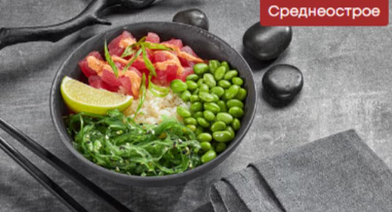 Состав: Тунец, бобы эдемаме, водоросли чука, лук зеленый, кунжут, соус гамадари, соус спайси, соус азиатский, лайм, рис.