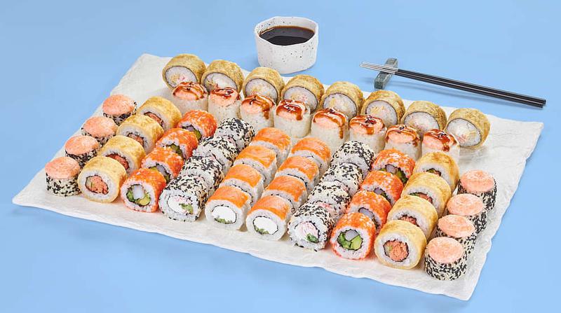Состав: Миссури (8 шт.), Филадельфия лайт с огурцом (8 шт.), Калифорния с креветкой (8 шт.), Спешл (8 шт.), Фараон (8 шт.), Дакота (8 шт.), Сицилия (8 шт.) *Не забудьте заказать имбирь, васаби и соевый соус. Они не входят в стоимость заказа.