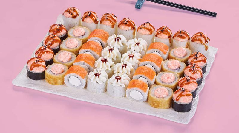 Состав: Филадельфия лайт (8 шт.), Белоснежка (8 шт.), Нежный с курицей (8 шт.), Южный (8 шт.), Беби (8 шт.) *Не забудьте заказать имбирь, васаби и соевый соус. Они не входят в стоимость заказа.