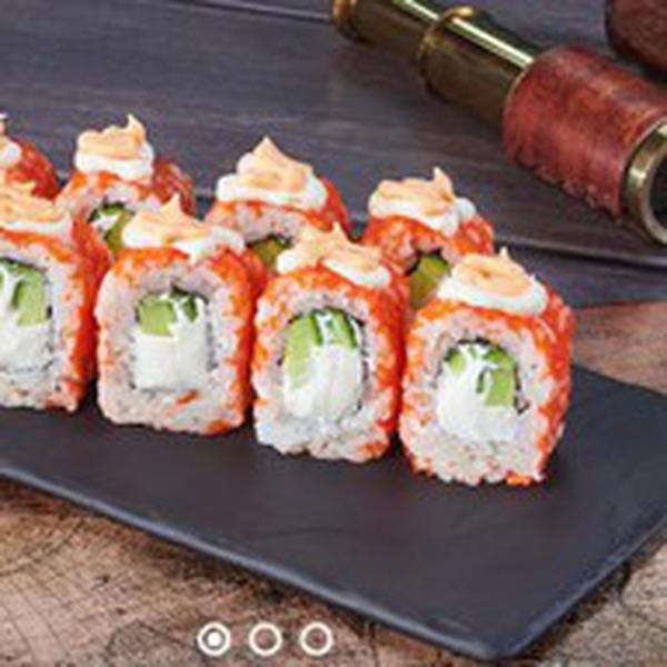 Состав: Сыр сливочный, огурец, икра масаго, соус цезарь, соус спайси, рис, нори. Не забудьте заказать имбирь, васаби и соевый соус. Они не входят в стоимость заказа.