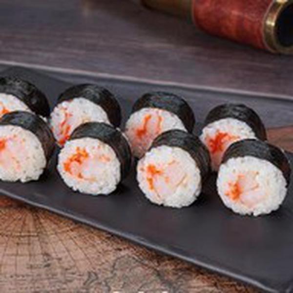 Состав: Креветка, икра масаго, рис, нори. Не забудьте заказать имбирь, васаби и соевый соус. Они не входят в стоимость заказа.