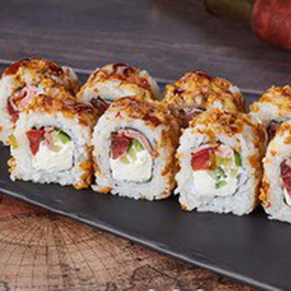 Состав: Бекон, сыр сливочный, огурец, помидор, лук фри, соус унаги, рис, нори. Не забудьте заказать имбирь, васаби и соевый соус. Они не входят в стоимость заказа.