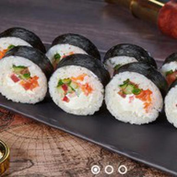 Состав: Лосось, сыр сливочный, помидор, огурец, лук зеленый, рис, нори. Не забудьте заказать имбирь, васаби и соевый соус. Они не входят в стоимость заказа.