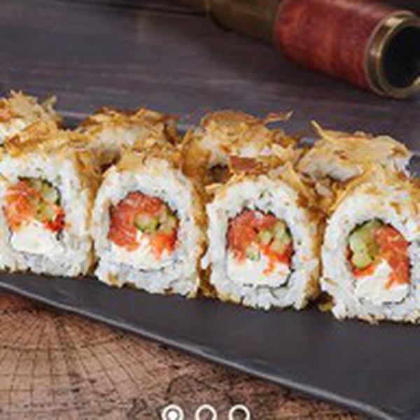 Состав: Лосось, сыр сливочный, стружка тунца, икра масаго, огурец, рис, нори. Не забудьте заказать имбирь, васаби и соевый соус. Они не входят в стоимость заказа.